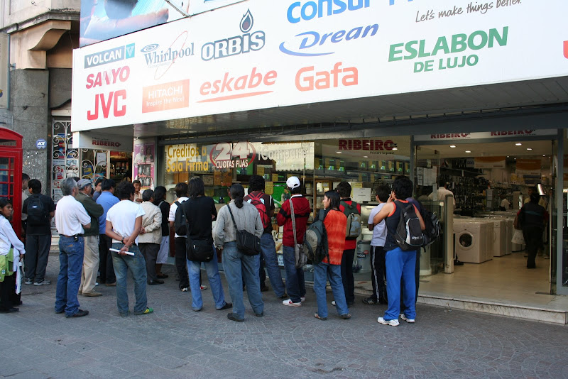 Onze laatste stedelijke stop in Argentinie is Jujuy, de hoofdstad van de noordelijke provincie maar dan ook niets meer dan een provinciestadje. Behalve het afhandelen van wat administratieve zaken en een, volgense onze lonely planet, niet te missen bezoek aan de plaatselijke termen is er dan ook niet veel te doen. Niet te missen bleek bij aankomst niet geheel lichtjes maar zelfs zwaar overdreven. Een betonnen barak en een blauw zwembad met, weliswaar natuurlijk, warm water. Het moet gezegd, het uitzicht op de omringende valei en bergtoppen was mooi. De foto toont de Argentijnse reactie op de match Chelsea-Manchester United (denk ik), voor elke winkel met een TV stond een grote groep mannen, die zich volop lieten gaan als er gescoord werd, grappig en typisch.
